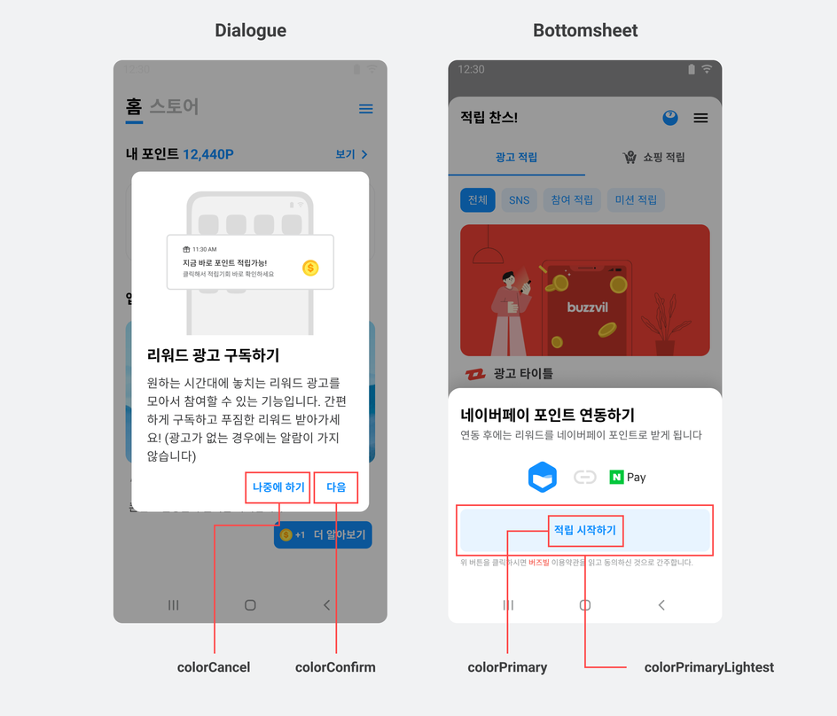 BuzzAd Android용 SDK에서 제공하는 UI 중 다이얼로그의 버튼 색상, 바텀 시트 UI의 확인 버튼 등 앱에 연동한 모든 지면 내 주요 UI의 색상(Primary color)을 GlobalTheme을 사용해 변경할 수 있습니다.