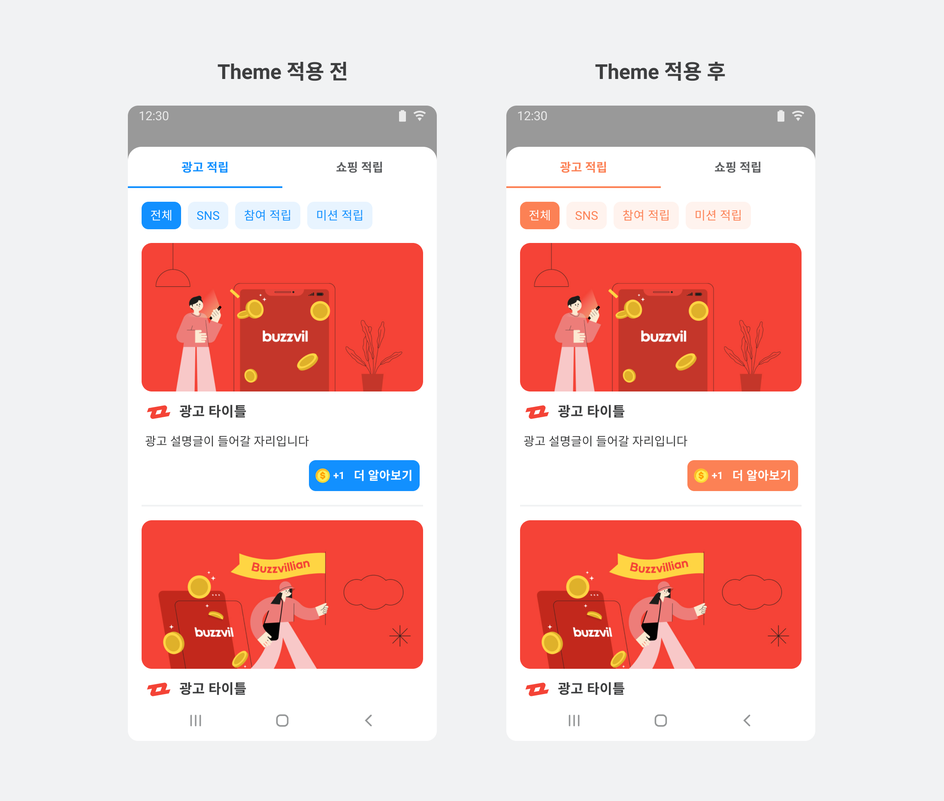 BuzzAd Android용 SDK에서 제공하는 기본 UI를 사용해 광고 지면의 색상, 아이콘 이미지 등 테마를 변경할 수 있습니다.