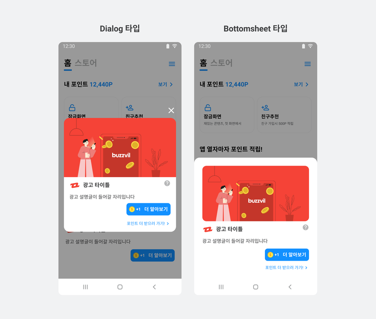 인터스티셜 지면은 BuzzAd Android용 SDK에서 제공하는 UI를 사용해 앱을 완전히 덮으면서 노출되며 쉽게 연동할 수 있습니다. 또한 광고 지면이 앱을 덮기 때문에 앱 UI와의 조합을 고려하지 않고 노출하기 용이합니다. 다이얼로그(Dialog)와 바텀 시트(Bottomsheet) UI를 제공하여 원하는 기획에 맞게 선택하여 연동할 수 있습니다.