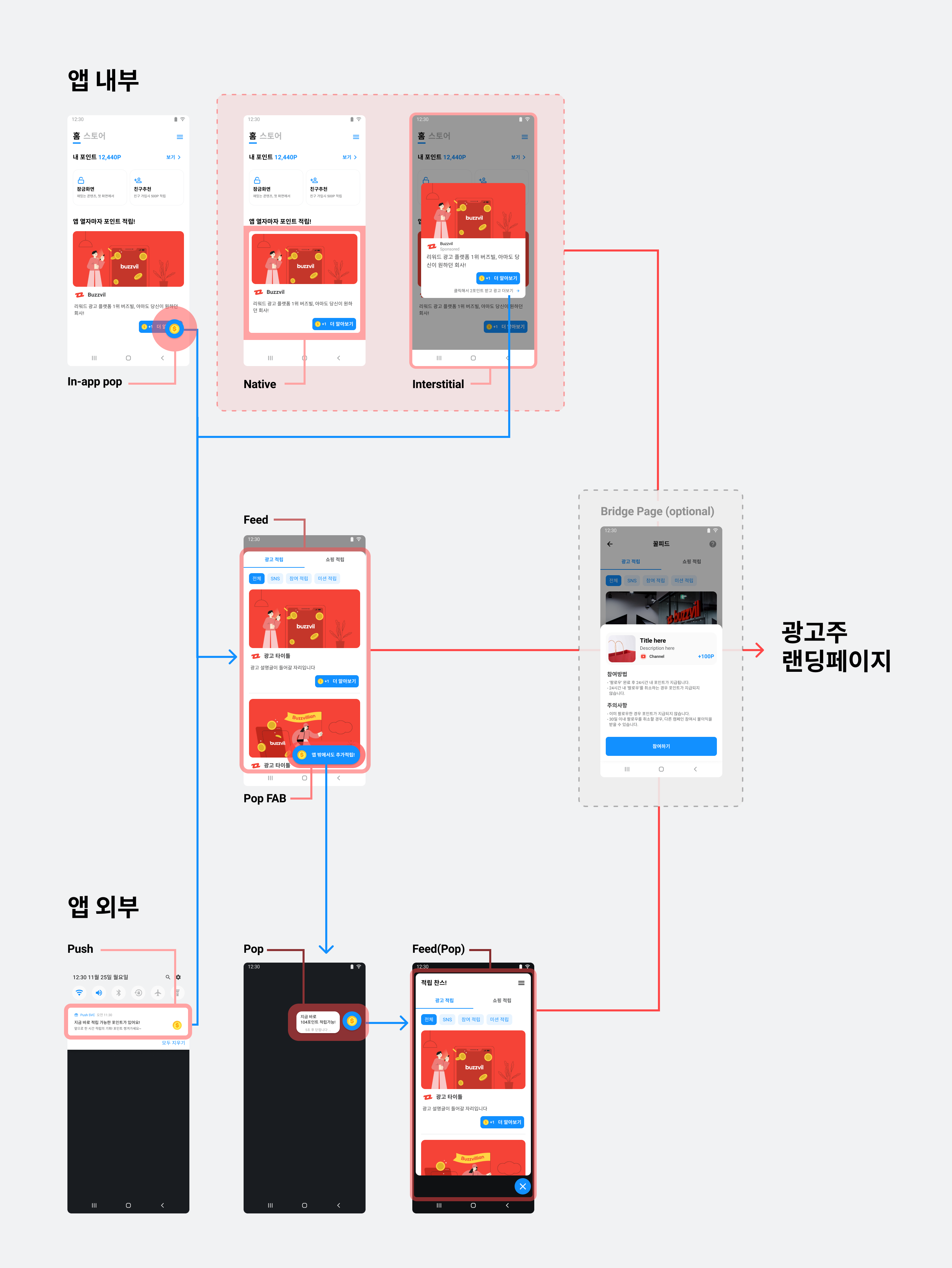 BuzzAd Android용 SDK를 사용하여 앱 내부와 외부에 다양한 유형의 지면을 연동하고 국내 최다 광고 물량을 공급하는 버즈빌의 비보상형 광고, 리워드 기술을 적용한 보상형 광고를 게재할 수 있습니다. SDK에서 제공하는 기본 UI를 사용해 쉽고 빠르게 지면 연동과 구현이 가능하며, 뷰 맞춤 구현을 통해 원하는 기능을 자체적으로 추가할 수 있습니다. 또한 각 지면의 디자인을 커스터마이징해 높은 수준의 사용자 경험을 제공하고, 지면 경로를 설계해 한층 더 많은 사용자의 유입을 유도할 수도 있습니다.