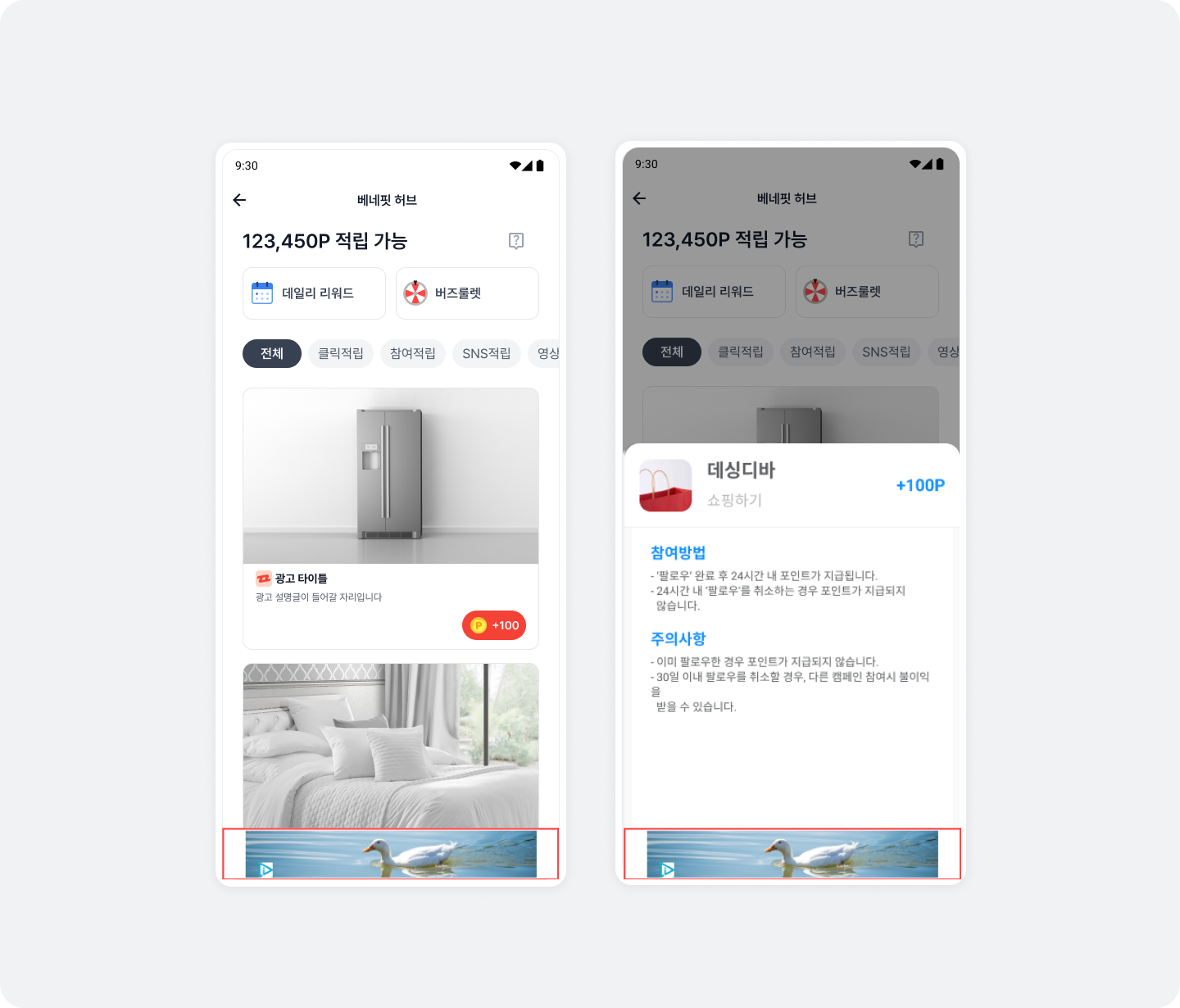 버즈배너(BuzzBanner)는 사용자 경험을 고려한 동시에 인벤토리 수익을 증대할 수 있는 비보상형 광고 상품입니다. 버즈배너는 베네핏허브 또는 팝 베네핏허브와 광고 참여 안내 페이지 아래 영역에 연동할 수 있으며, 이 외에도 원하는 위치 어디에나 연동할 수 있습니다.