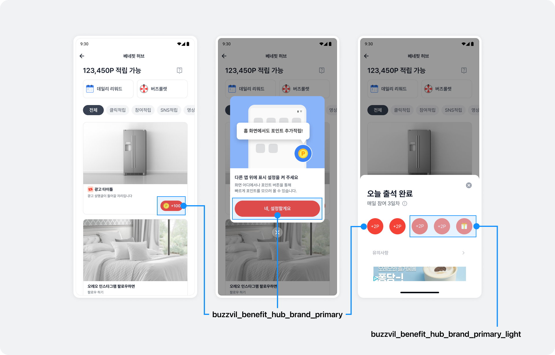 리소스 이름은buzzvil_benefit_hub_brand_primary,buzzvil_benefit_hub_brand_primary_light를 그대로 사용해야 합니다.