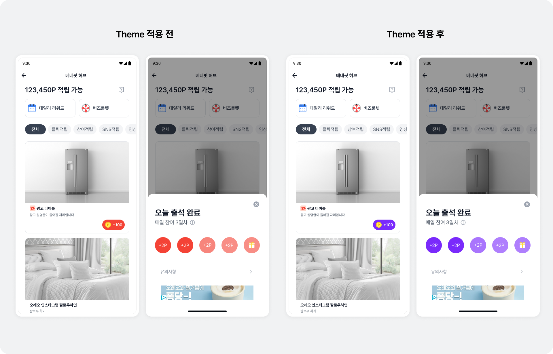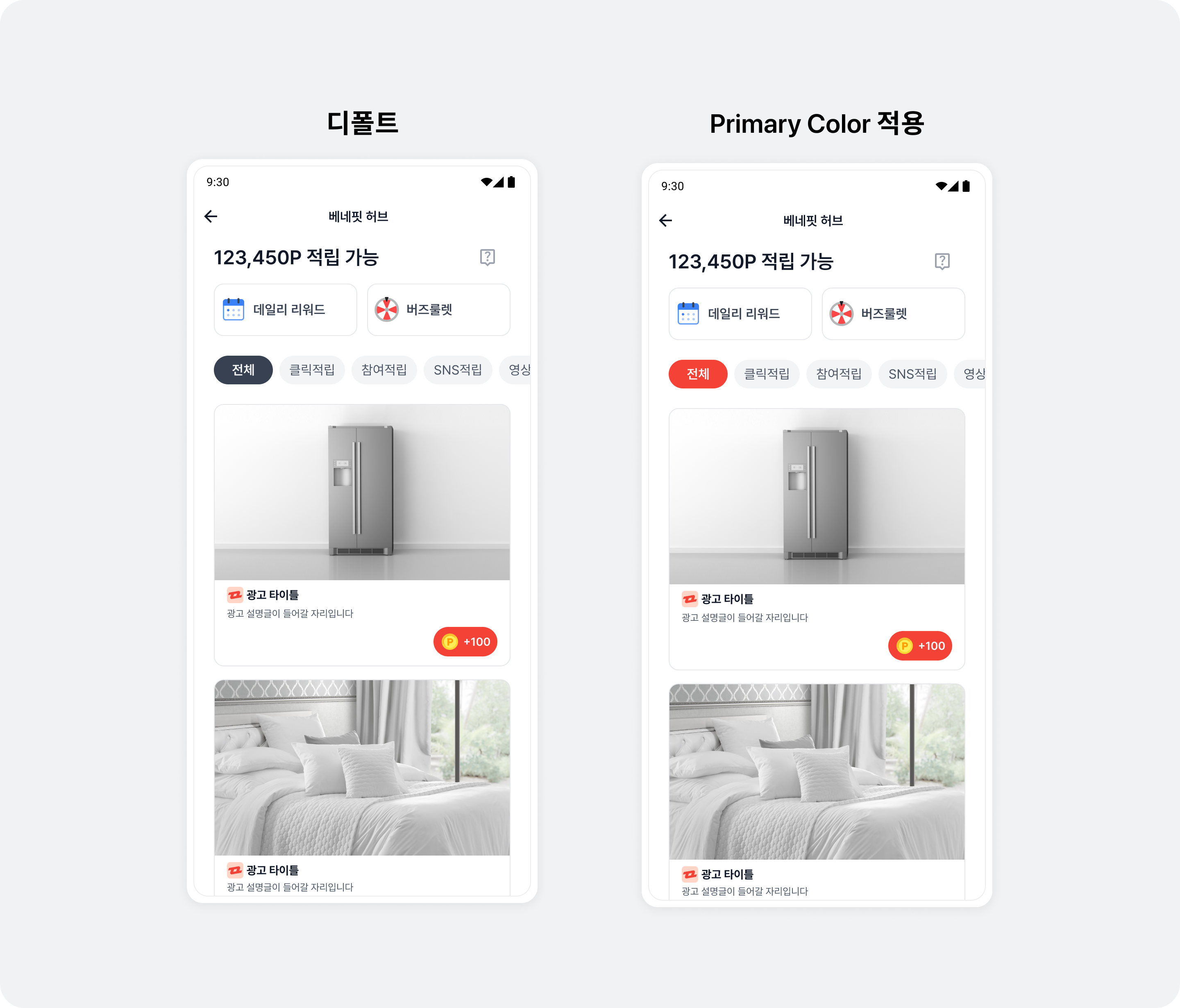 주요 UI의 색상(Primary color)을 변경할 수 있는 GlobalTheme을 사용해 진입 경로 레이아웃의 베네핏허브 진입 유도 문구 색상, CTA 버튼 배경 색상과 리워드 아이콘이 함께 변경됩니다. 자세한 내용은 전체 테마 토픽을 참고하세요.
