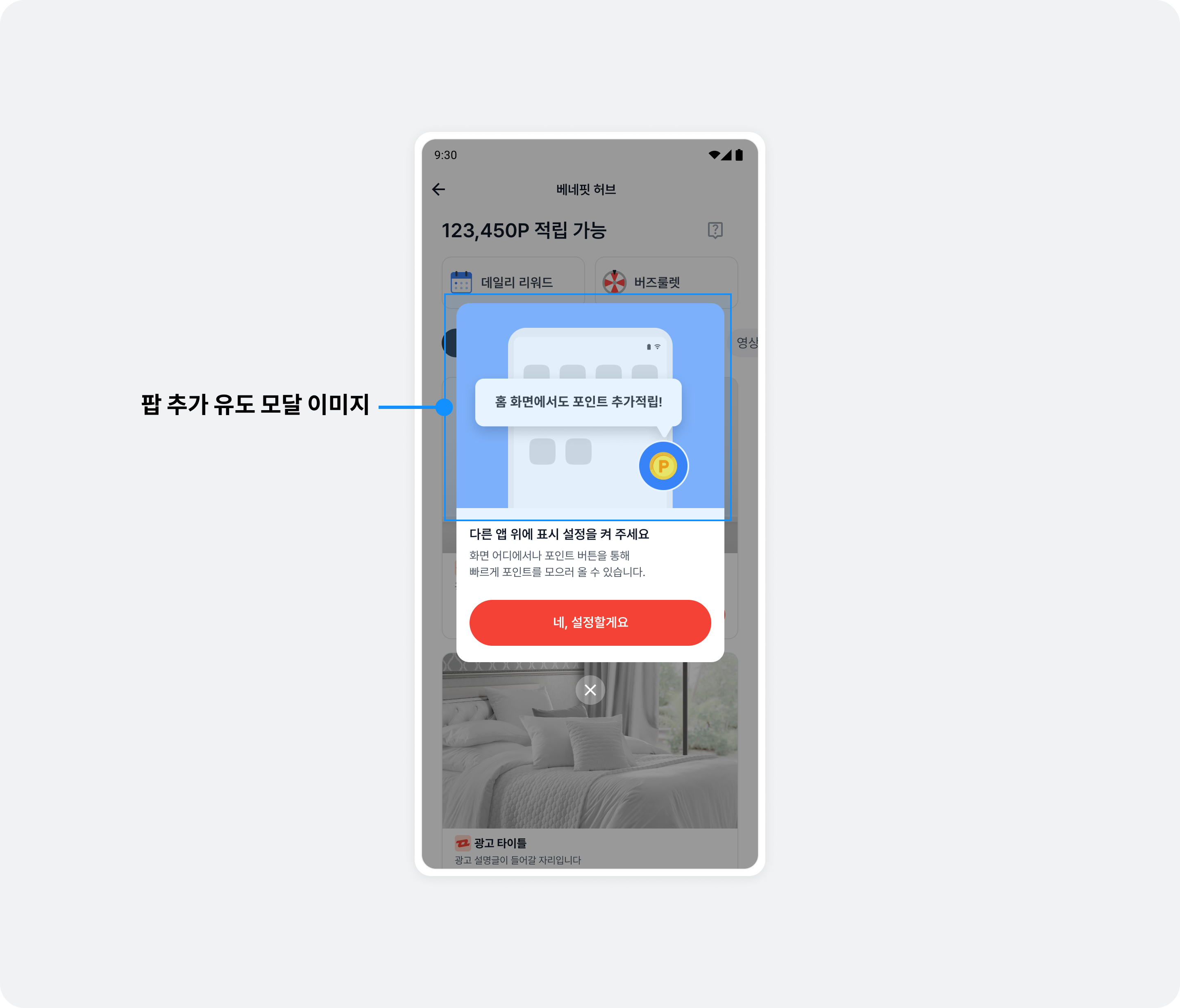 팝을 연동한 경우 유저에게 팝 버튼 활성화를 유도하는 모달의 이미지를 변경할 수 있습니다.