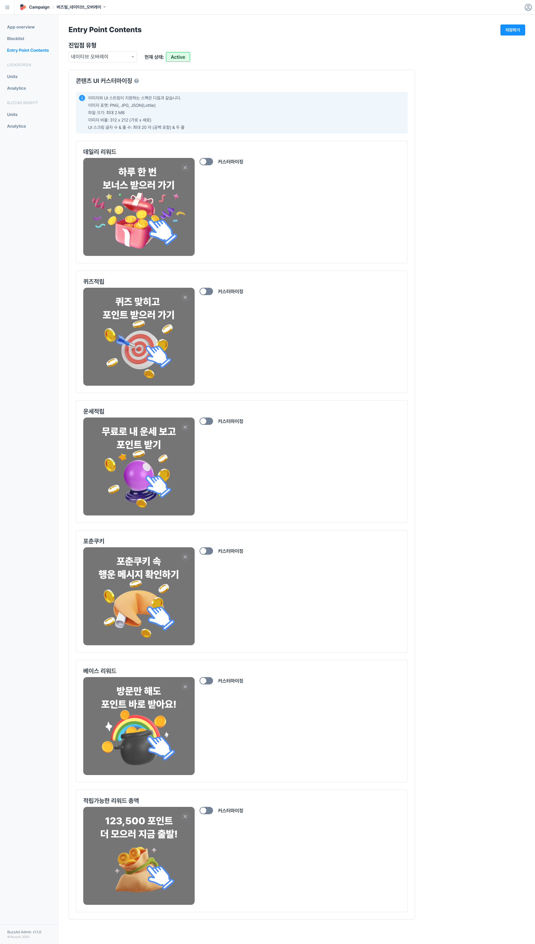 버즈빌 대시 어드민을 통해 오버레이 UI를 구성하는 이미지와 텍스트를 설정할 수 있습니다.