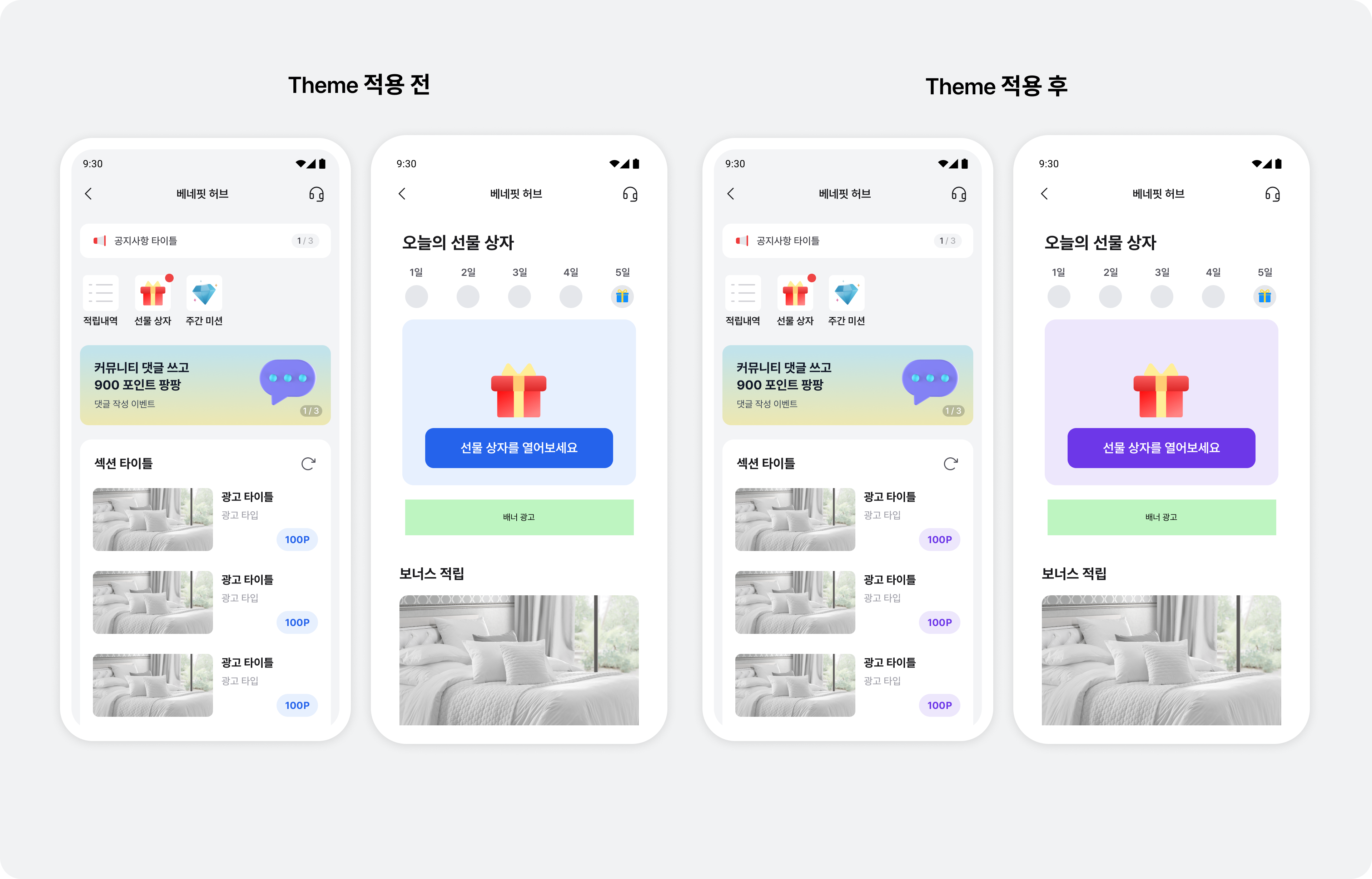 Buzzvil SDK에서 제공하는 기본 UI를 사용해 광고 지면이나 CTA의 색상, 아이콘 이미지 등 테마를 변경할 수 있습니다.