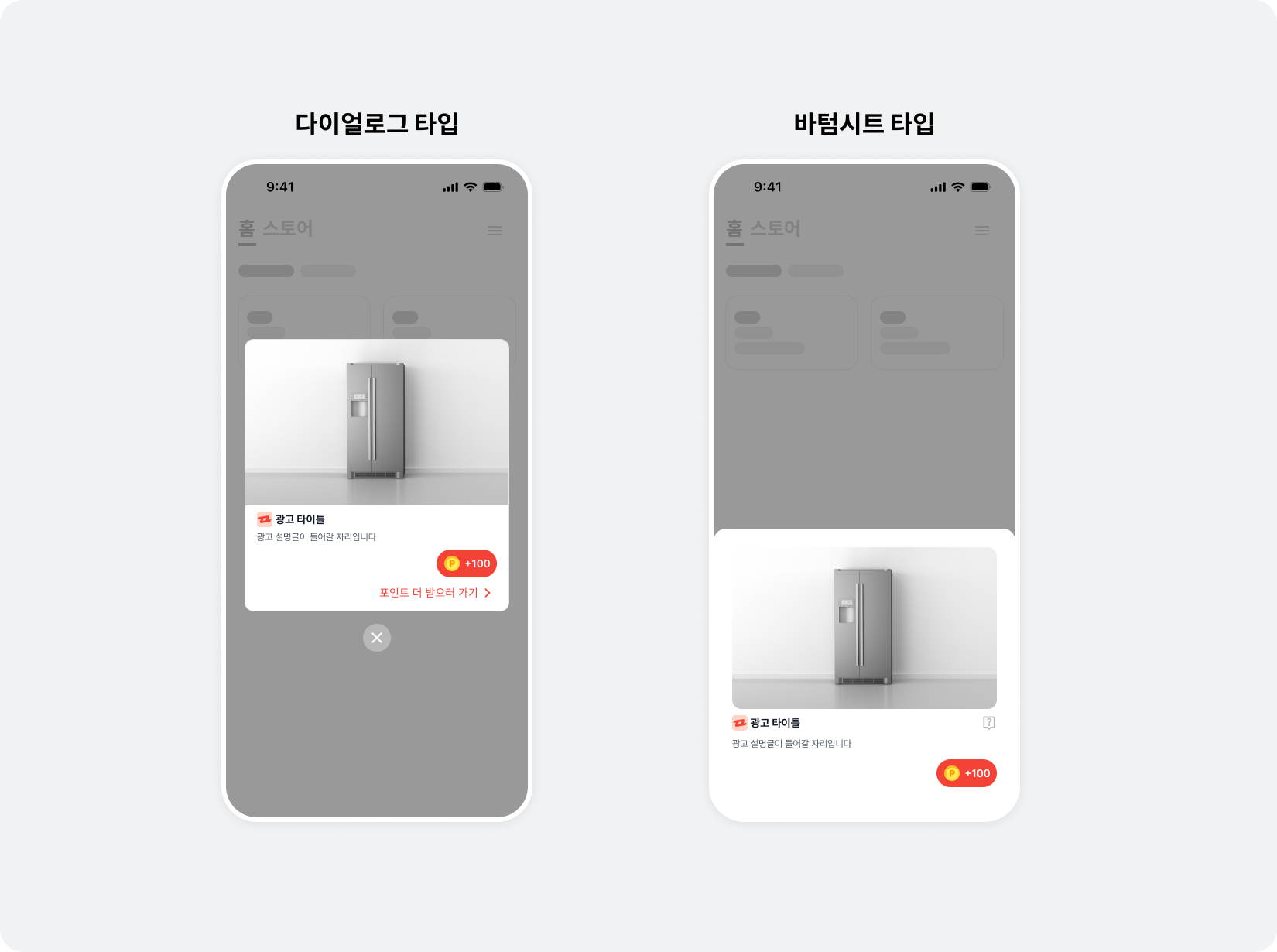인터스티셜 지면은 앱을 완전히 덮으면서 노출되며 쉽게 연동할 수 있습니다. 또한 광고 지면이 앱을 덮기 때문에 앱 UI와의 조합을 고려하지 않고 노출하기 용이합니다. 다이얼로그(Dialog)와 바텀 시트(Bottomsheet) UI를 제공하여 원하는 기획에 맞게 선택하여 연동할 수 있습니다.