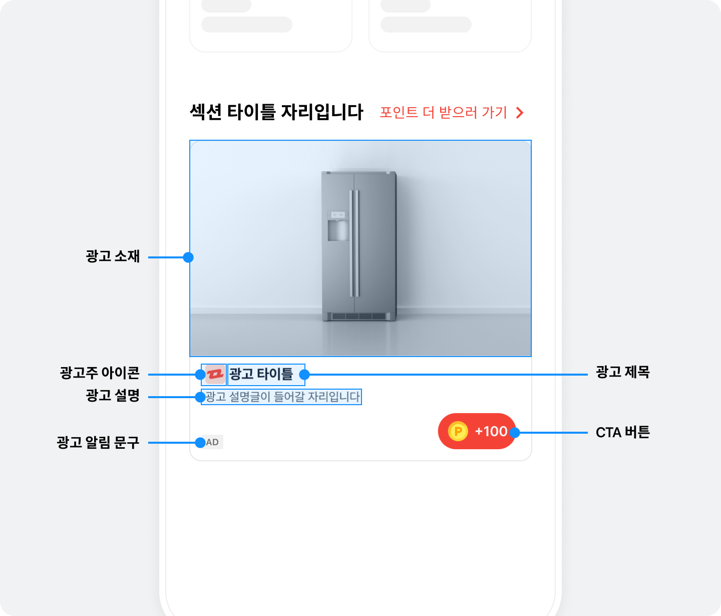 네이티브 광고 레이아웃을 구성하는 요소와 UI에 대해서는 아래의 그림과 표를 참고하세요.