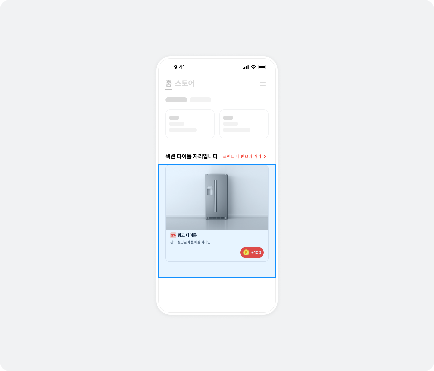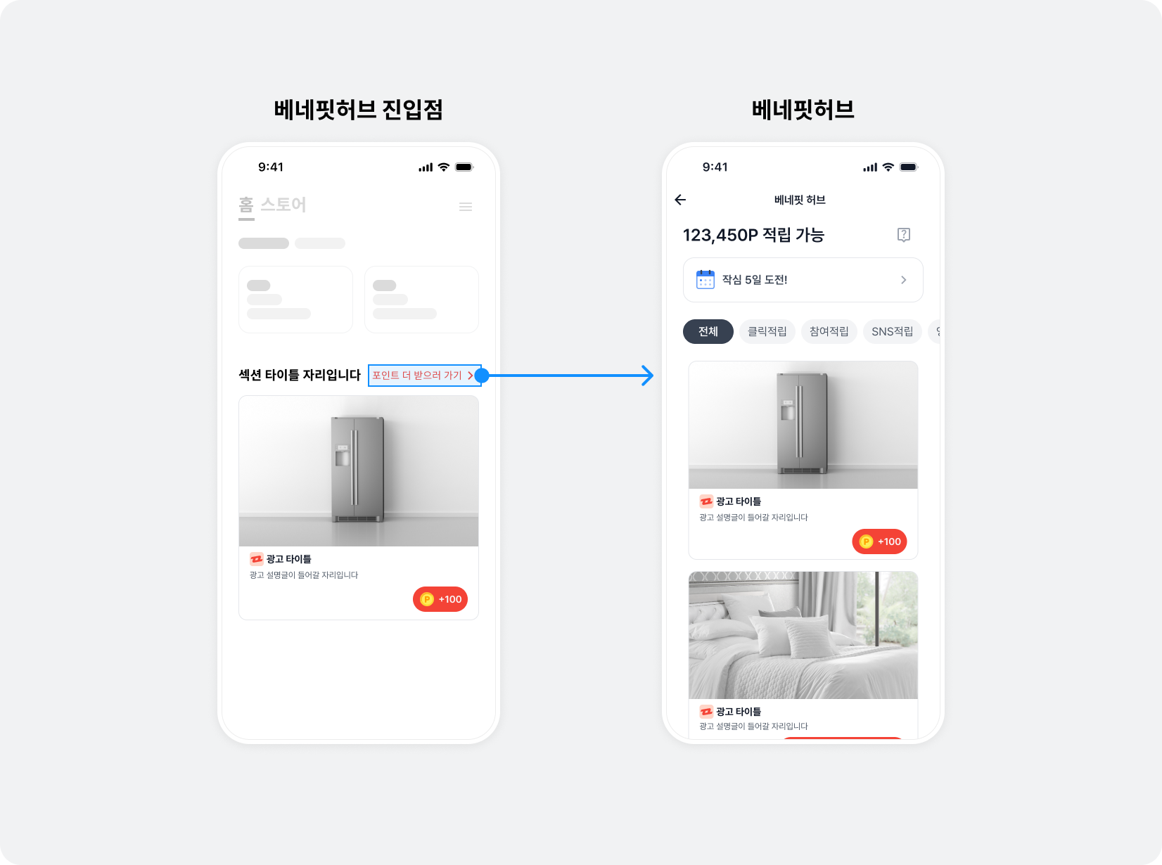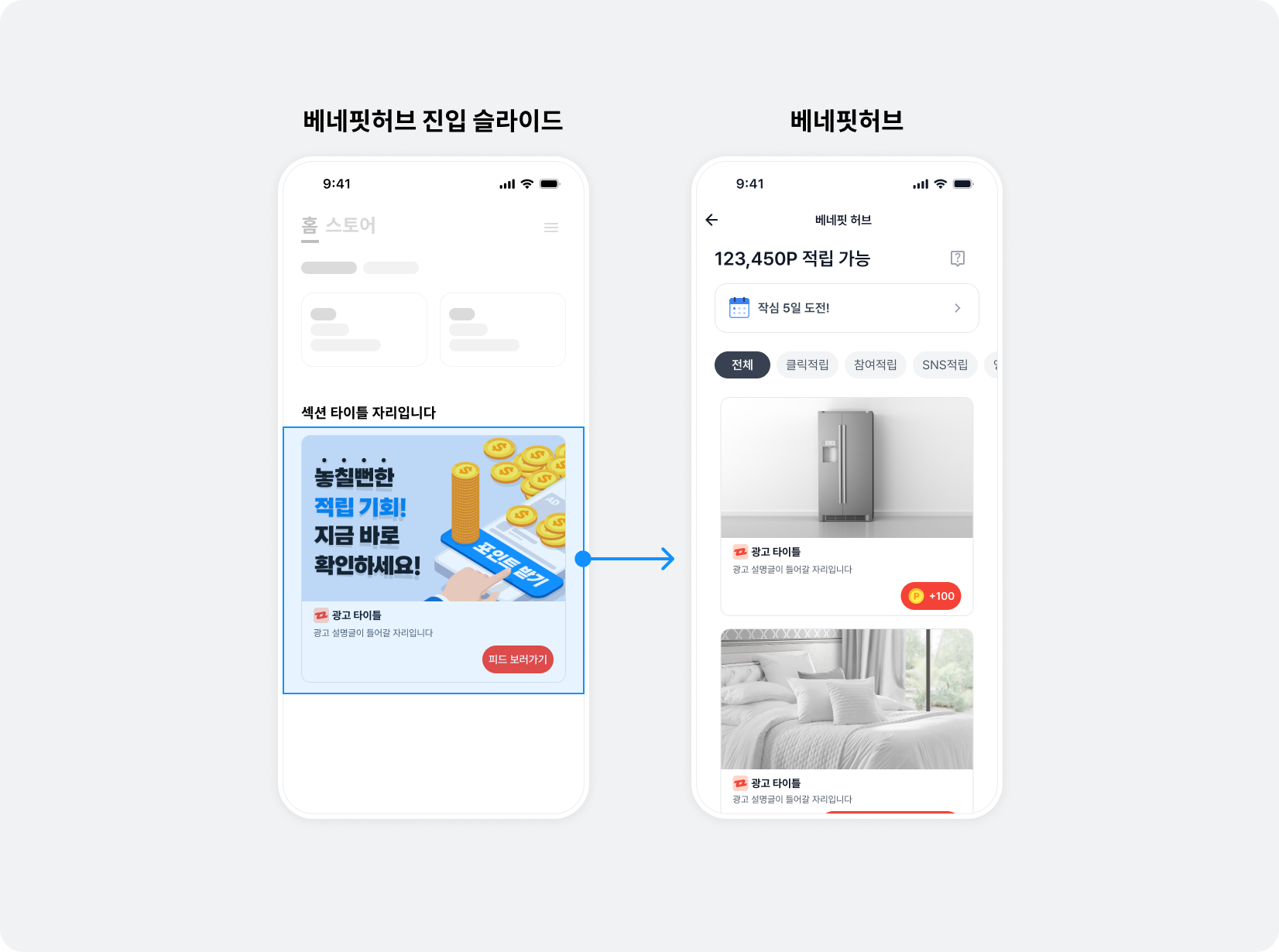 BZVNativeToFeedView은 자유롭게 구성할 수 있습니다. 그림과 같이 베네핏허브 이동 안내 텍스트와 화살표 아이콘을 적용하는 것을 추천합니다., 베네핏허브 이동 안내 텍스트에 베네핏허브에 진입만 해도 받을 수 있는 포인트를 표시할 수도 있습니다. 자세한 내용은 베이스 리워드 금액 표시하기 토픽을 참고하세요.