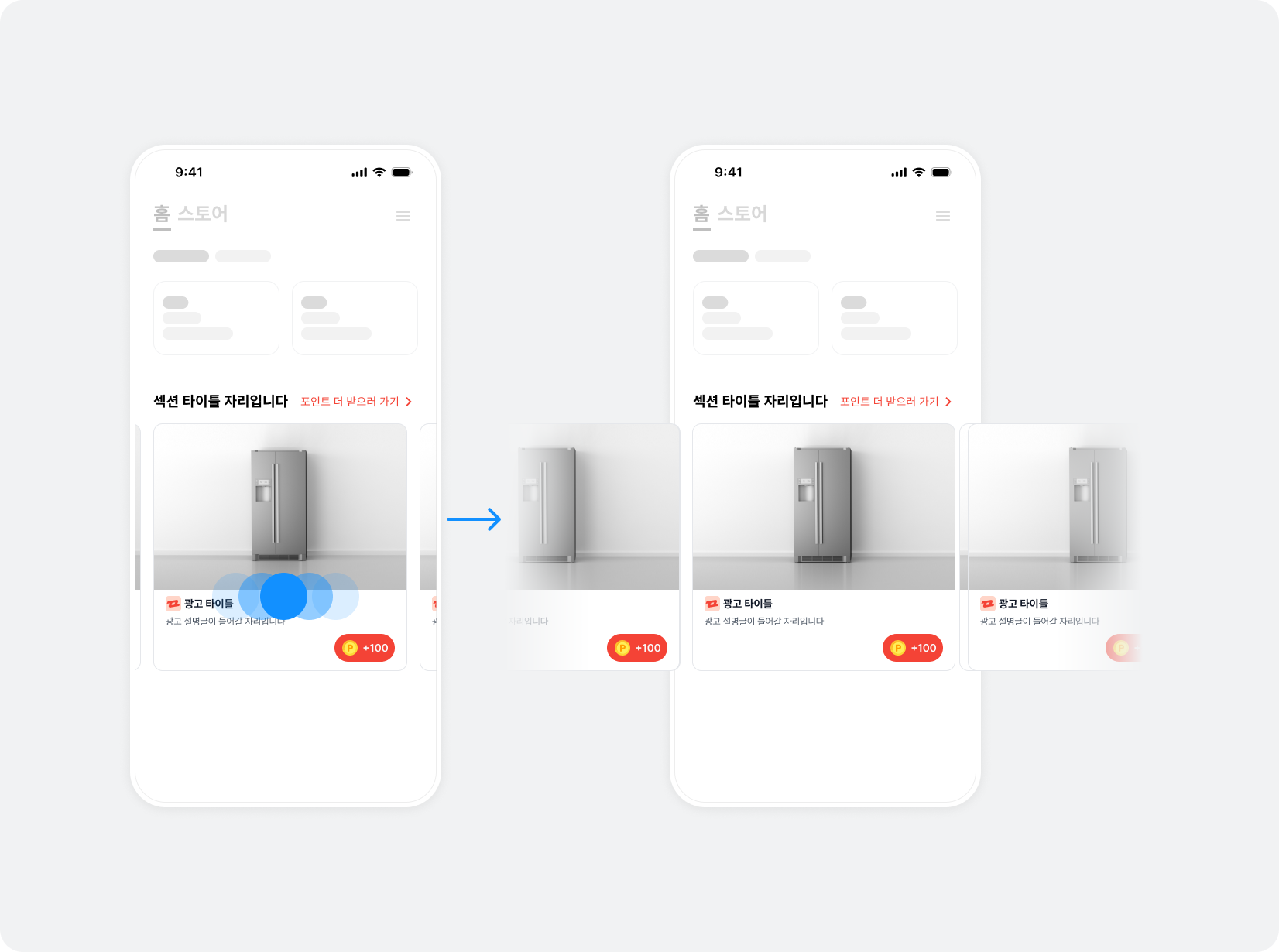 캐러셀 광고 아이템 사이의 여백을 조절하려면, 앞뒤 광고 아이템을 부분적으로 노출하기에서 설정했던 spacing 값을 적절히 조절합니다.