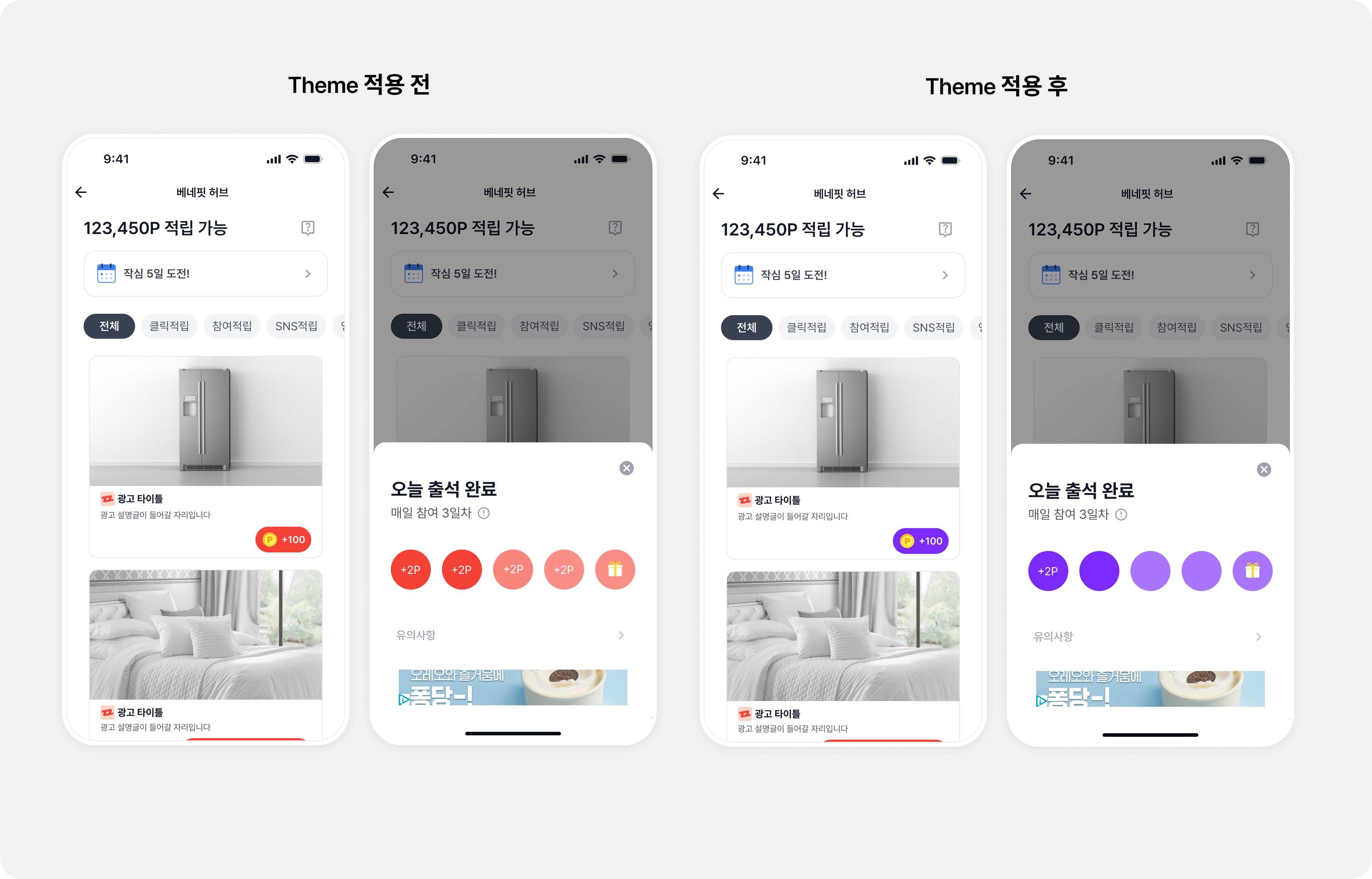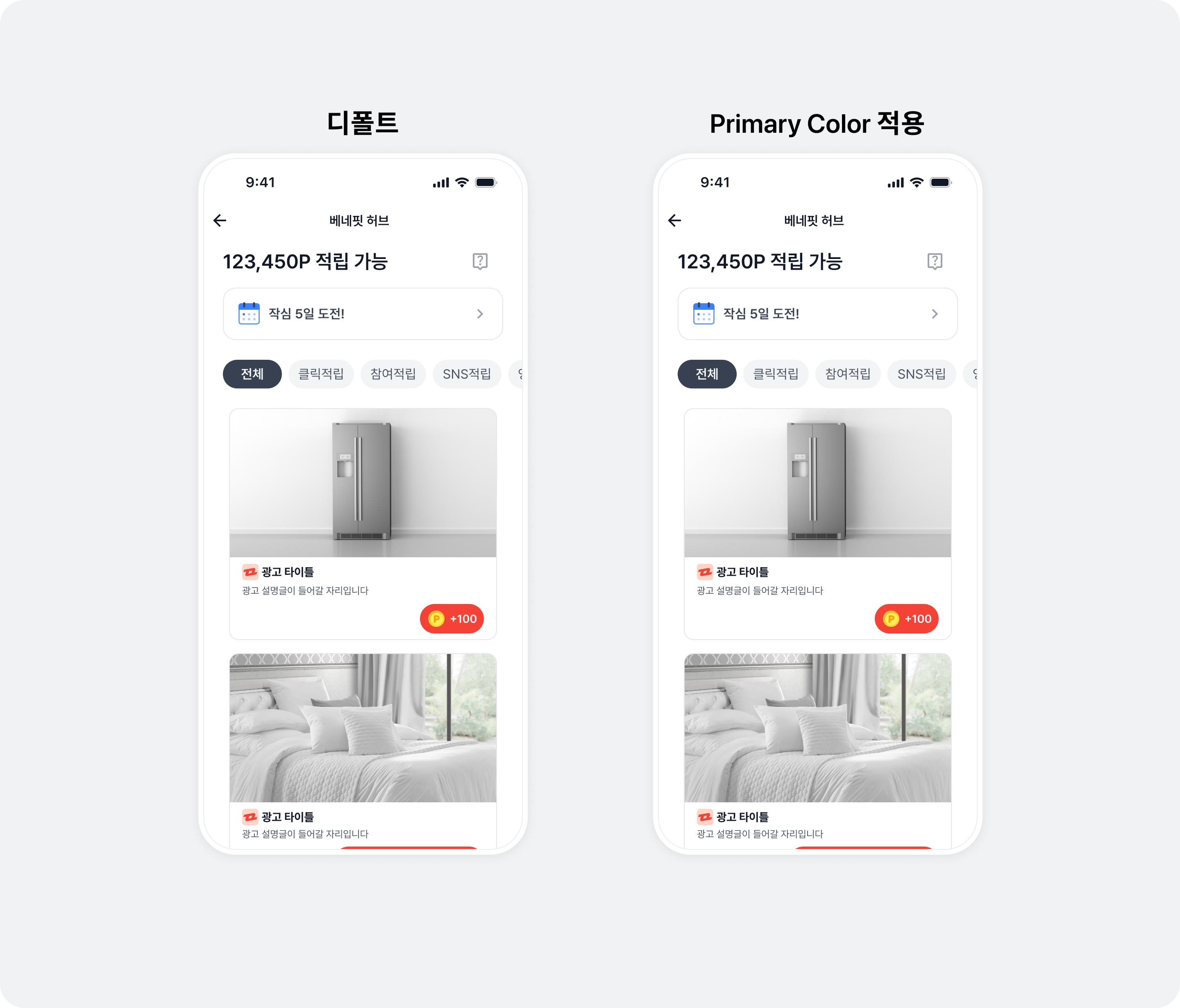 mary color)을 변경할 수 있는 GlobalTheme을 사용해 진입 경로 레이아웃의 베네핏허브 진입 유도 문구 색상, CTA 버튼 배경 색상과 리워드 아이콘이 함께 변경됩니다. 자세한 내용은 전체 테마 토픽을 참고하세요.