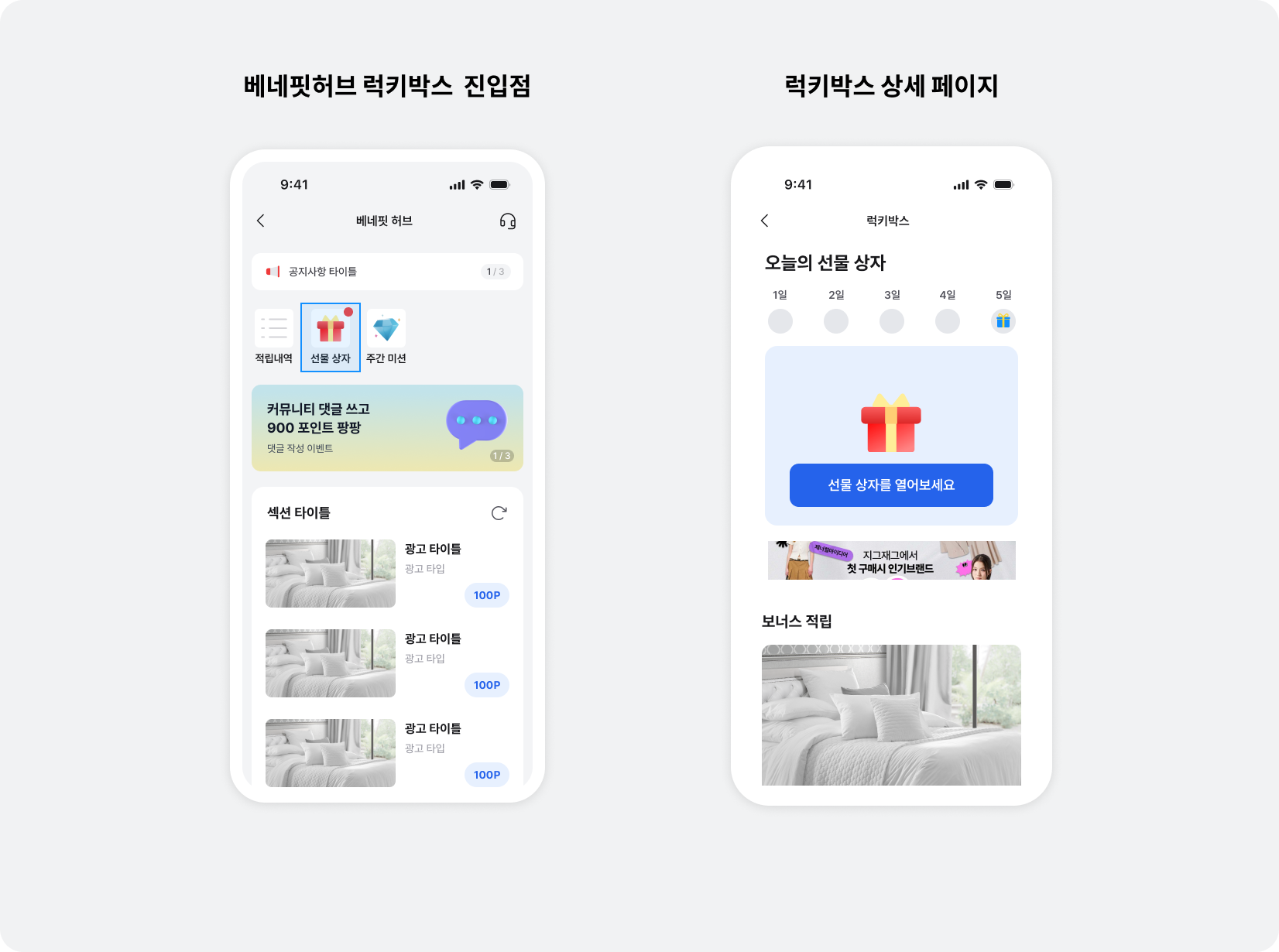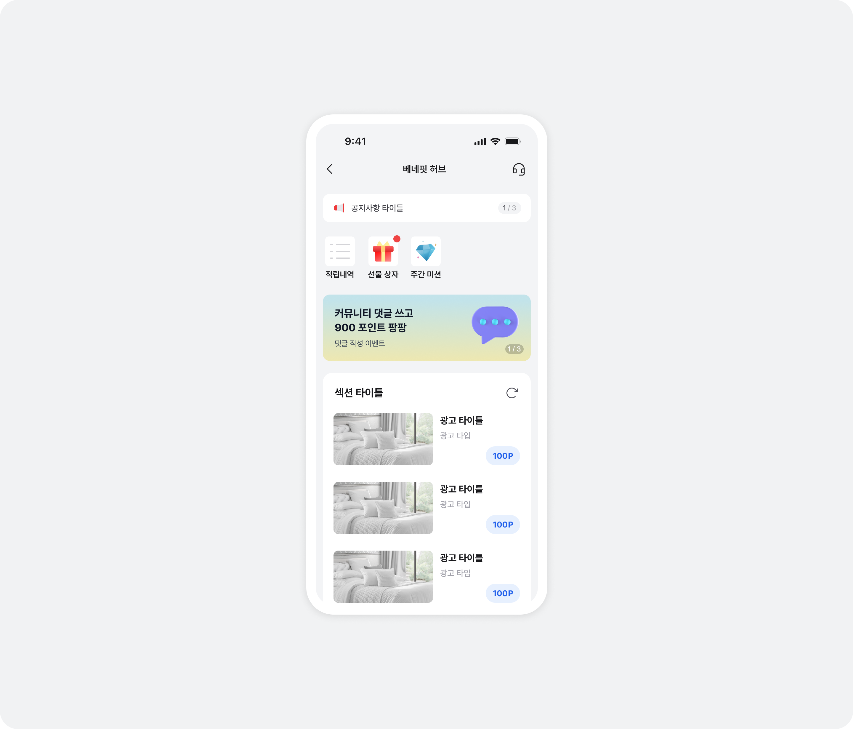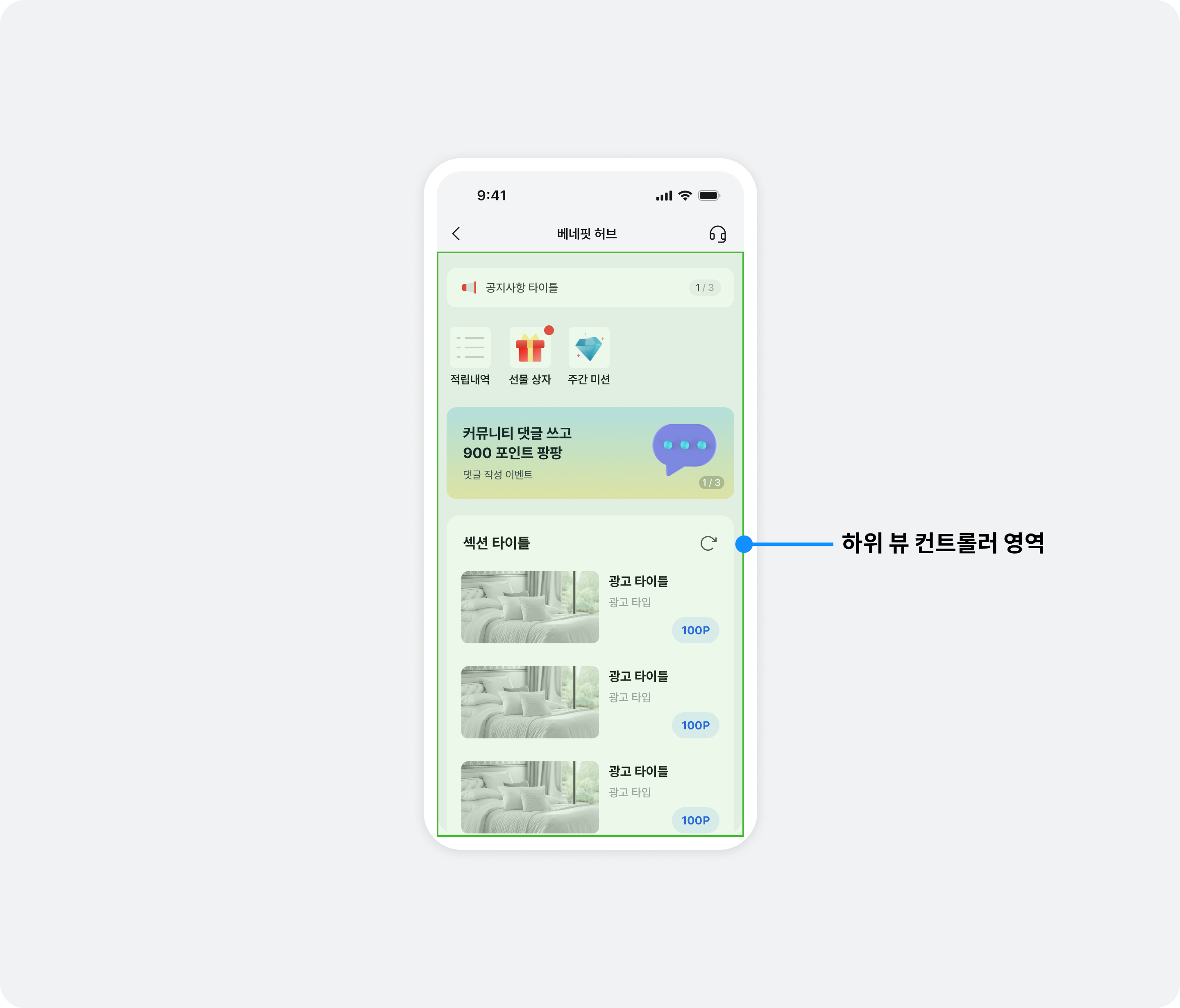 유저에게 다른 형태로 피드 지면을 제공하려면 하위 뷰 컨트롤러로 베네핏허브 연동하기 토픽을 참고하세요.