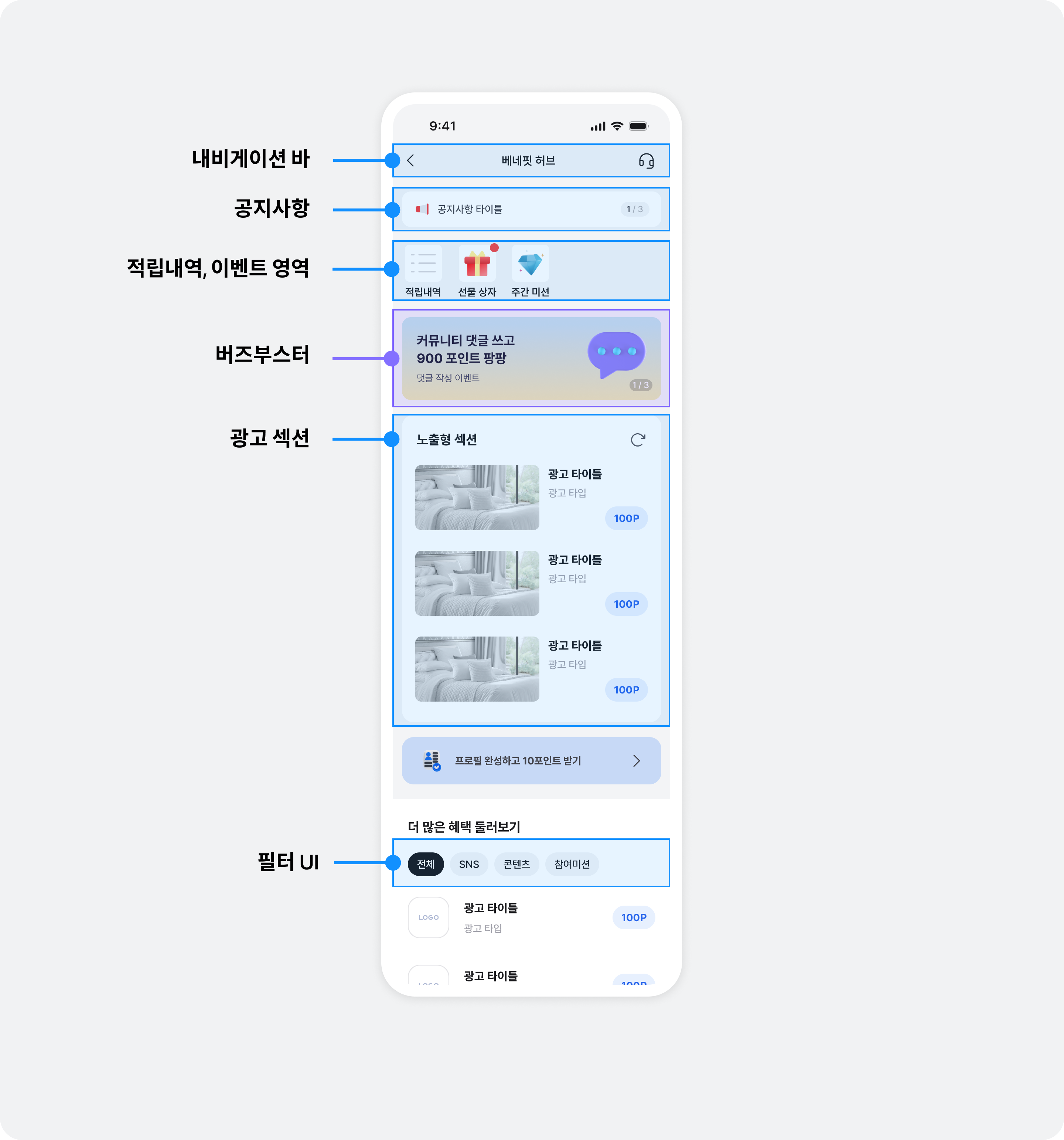 베네핏허브를 구성하는 주요 기능들은 아래 그림을 참고하세요.