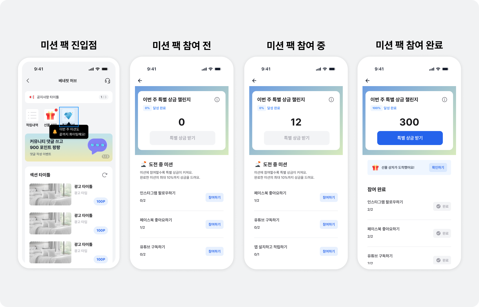 미션팩은 유저들이 광고를 참여해 받은 리워드의 일부분(%)을 미션을 모두 완수했을 때 특별 보상으로 지급하는 기능입니다. 매주 월요일에 자동으로 시작해 일요일 자정에 종료되는 주간 단위의 미션이며, 높은 매출 성과를 낼 수 있는 광고들을 게이미피케이션 요소를 통해 학습시키고 매출의 개선을 이뤄낼 수 있습니다. 미션팩 화면에서 유저가 "참여하기" 버튼을 클릭하면 미션에 맞는 광고를 곧바로 참여할 수 있는 화면 또한 제공합니다.