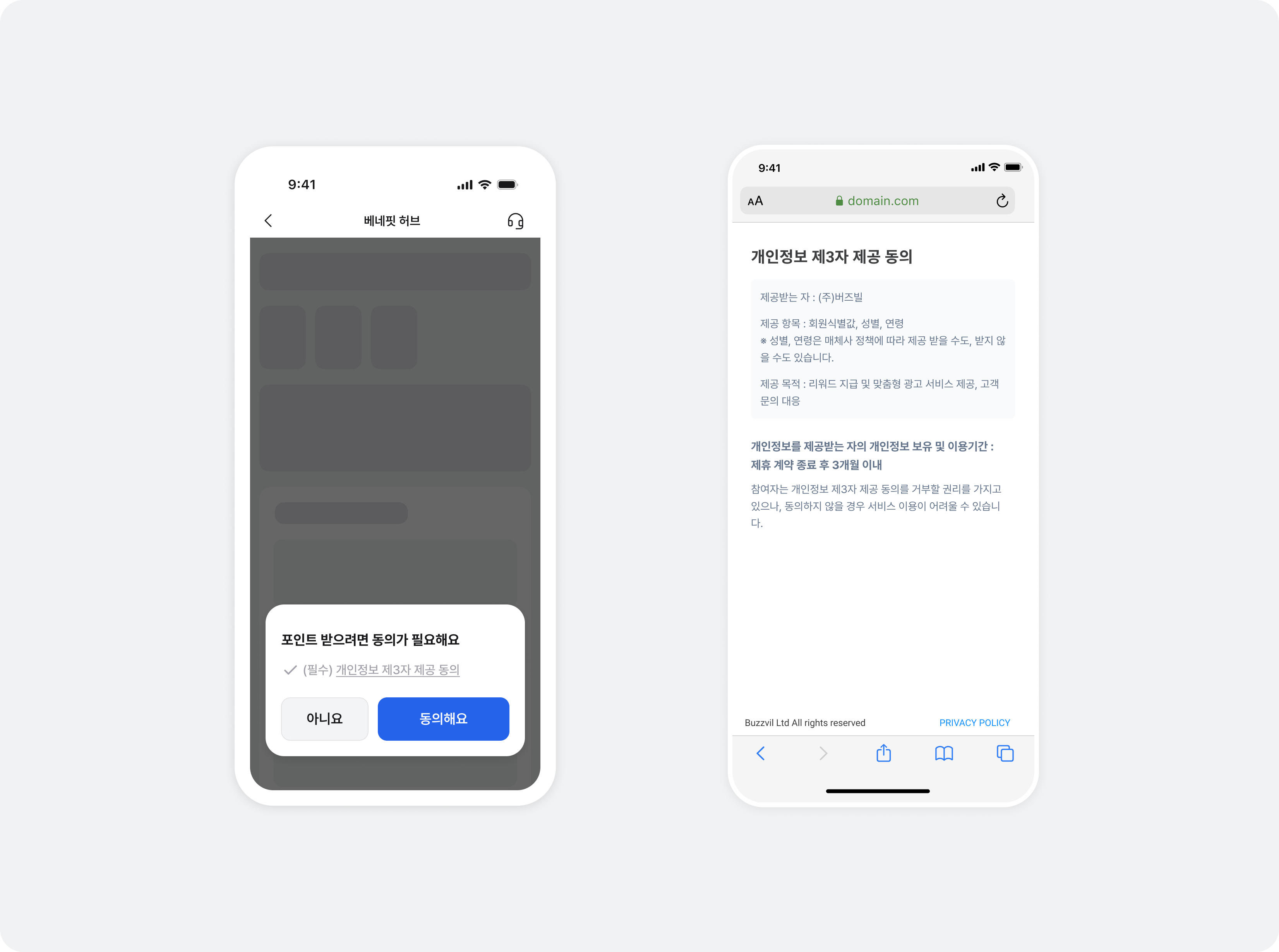 버즈빌과 개인정보 위수탁 관계이며 앱에서 자체적으로 제공하는 개인정보 처리방침 정책에 버즈빌을 수탁자로 포함하고 있다면, 여기에서 안내하는 개인정보 제3자 제공 동의 UI를 띄우지 않아도 됩니다.