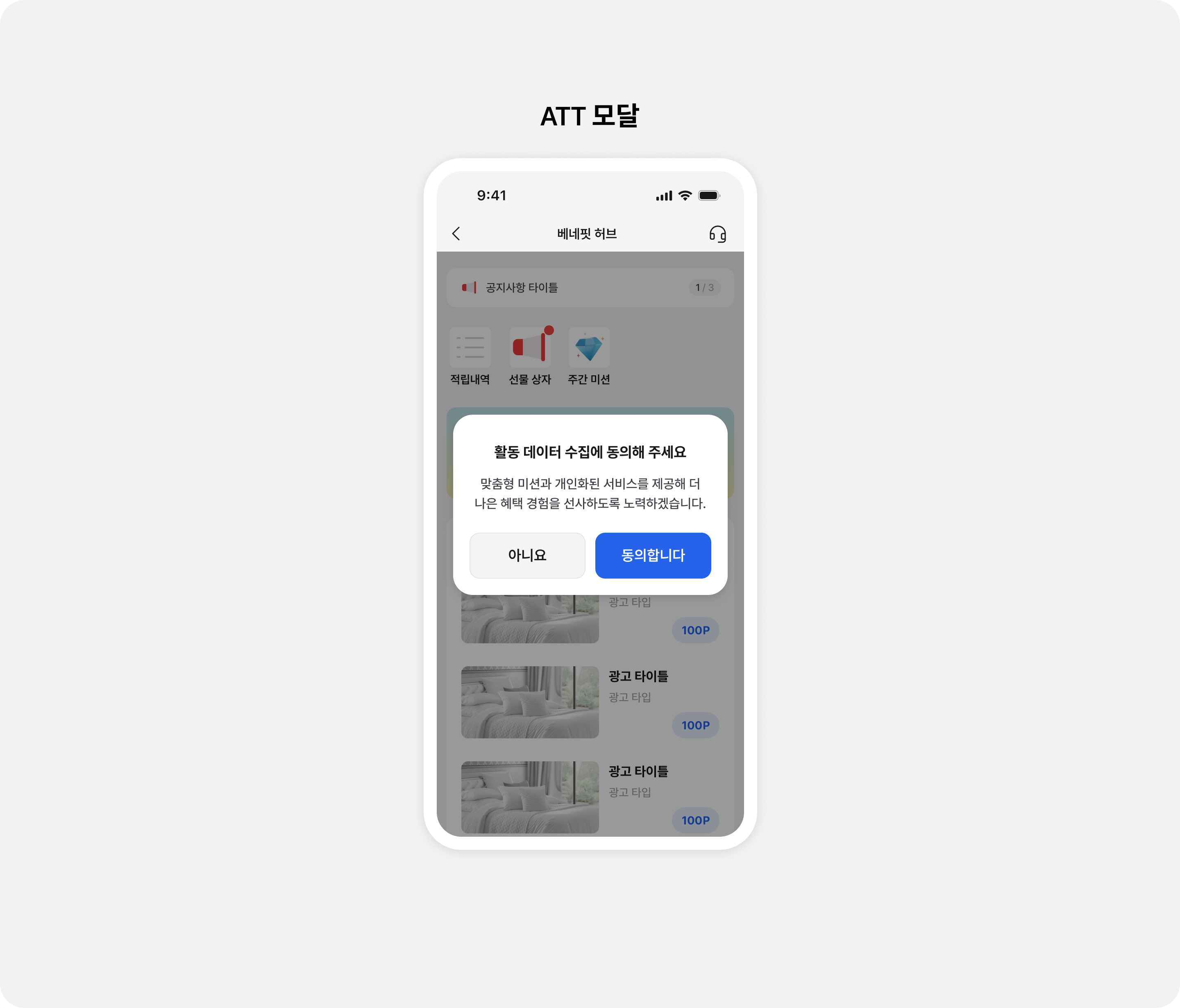 개인 정보 보호법에 따라, 개인 정보 수집 및 사용에 대한 유저의 동의가 필요합니다. Buzzvil SDK는 동의를 얻기 위한 UI를 제공하며, 유저가 개인 정보 수집에 동의하지 않으면, 베네핏허브에 광고가 할당되지 않습니다. 베네핏허브에 처음 진입한 유저에게는 아래와 같은 UI가 표시됩니다.