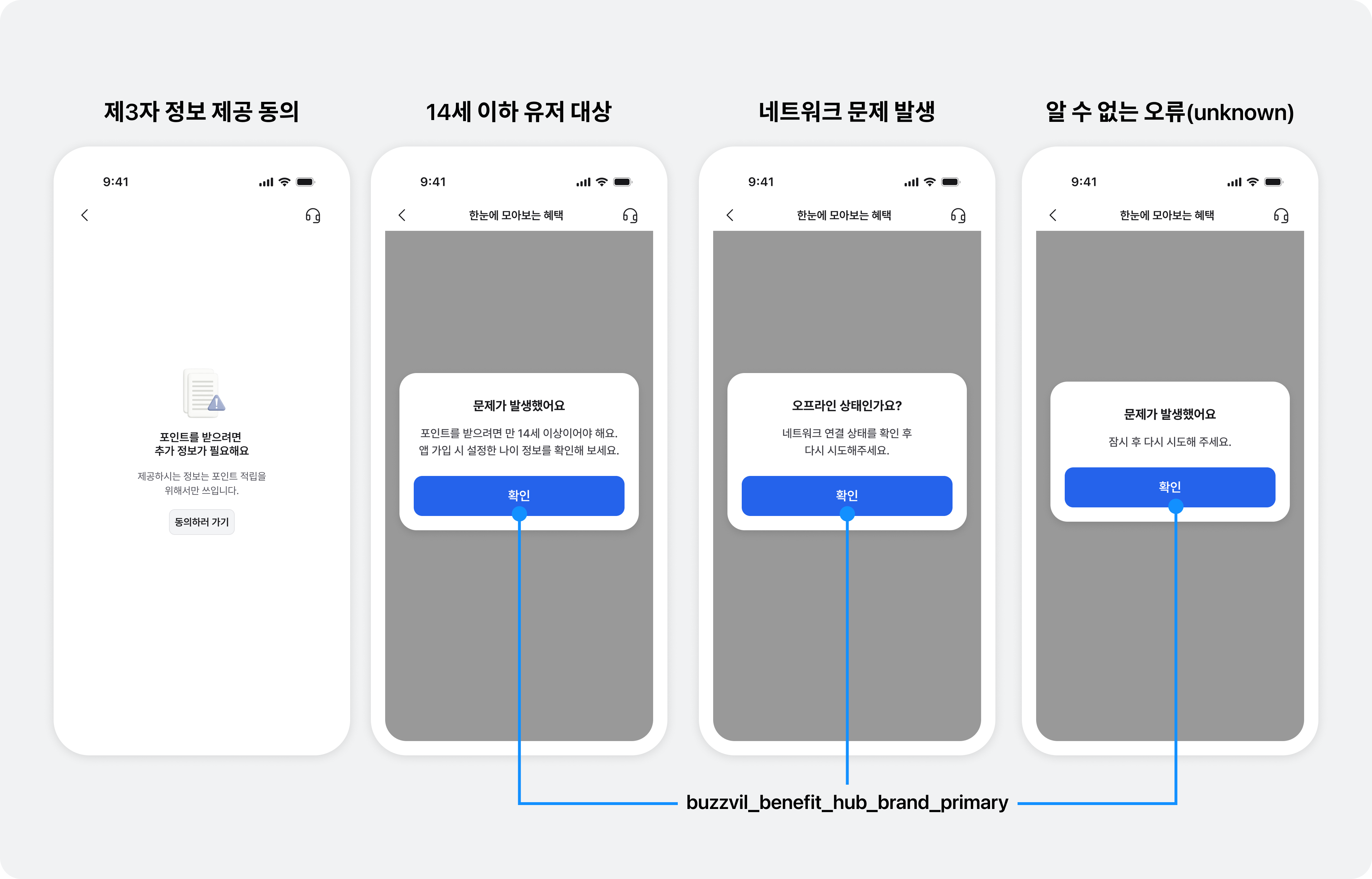 베네핏허브에서 광고 할당에 실패하는 경우, 상황에 따라 적절한 오류 화면이 노출됩니다. 각 오류는 유저의 상태나 네트워크 환경 등을 기반으로 구분되며, 명확한 안내 메시지와 함께 전체 테마에서 설정한 주요 색상의 버튼으로 일관된 UI를 제공합니다.