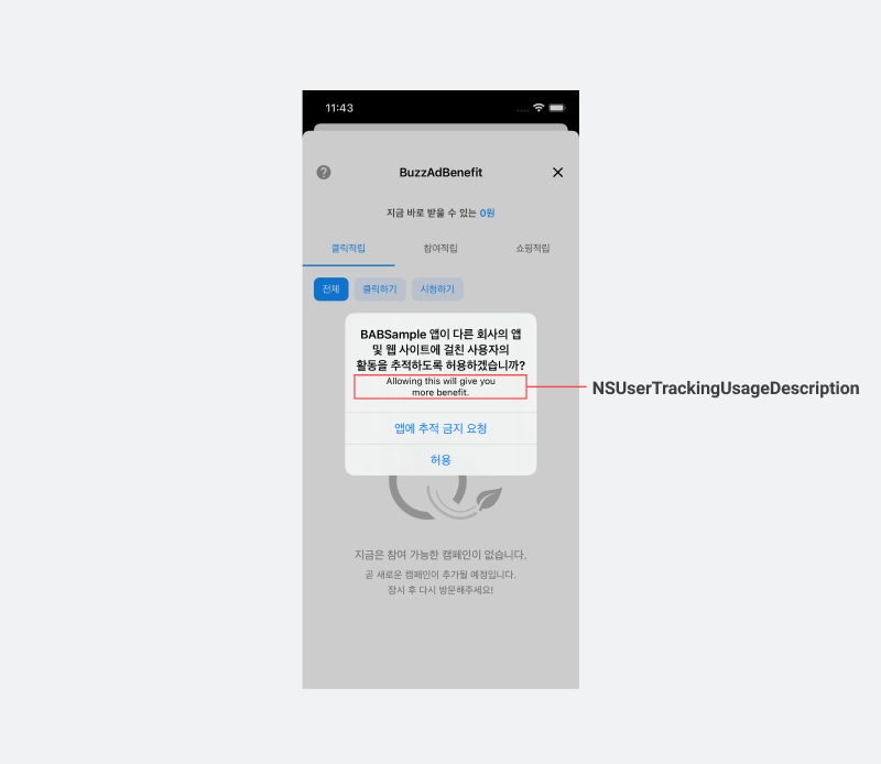 BuzzAd iOS용 SDK는 iOS 14 이상에서 사용자에게 활동 추적 권한 허용 팝업을 표시하는 기능을 제공합니다. 활동 추적 권한 허용에 대한 자세한 내용은 Apple 공식 문서를 확인하세요.