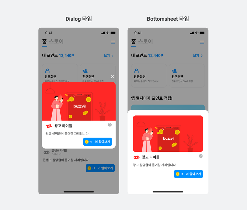 인터스티셜 지면은 BuzzAd iOS용 SDK에서 제공하는 UI를 사용해 앱을 완전히 덮으면서 노출되며 쉽게 연동할 수 있습니다. 또한 광고 지면이 앱을 덮기 때문에 앱 UI와의 조합을 고려하지 않고 노출하기 용이합니다. 다이얼로그(Dialog)와 바텀 시트(Bottomsheet) UI를 제공하여 원하는 기획에 맞게 선택하여 연동할 수 있습니다.