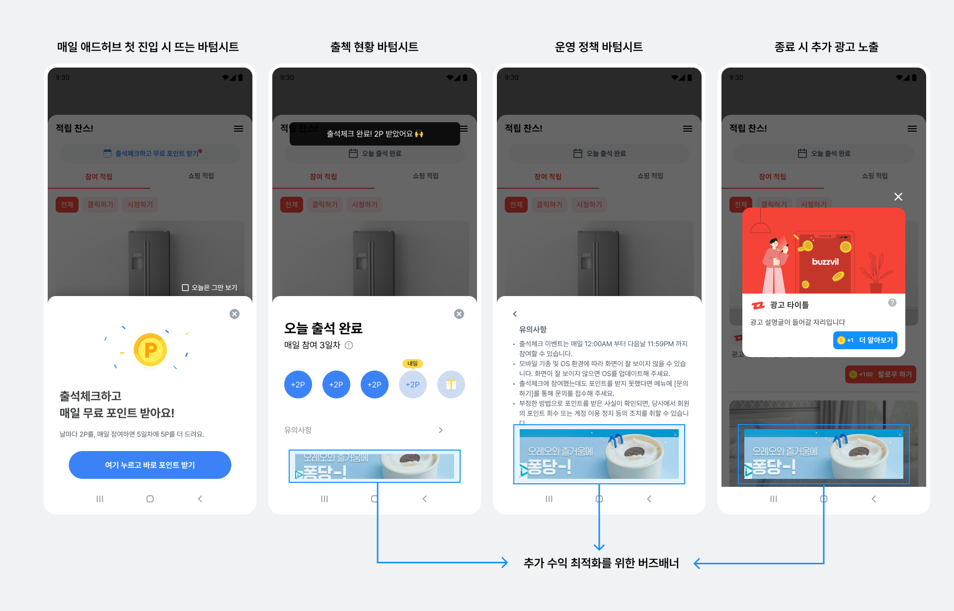 데일리 리워드는 매일 유저가 처음 애드허브에 진입하면 출석체크 버튼을 터치할 수 있는 바텀시트로 시작합니다. 바텀시트에서 출석체크 버튼을 터치하면 출첵 포인트 적립을 알리는 토스트 메시지와 함께 출석 현황과 5일 연속 출석 중 몇 일째 달성 중인지 확인 가능한 바텀시트로 전환됩니다. 유저가 데일리 리워드 플로우를 종료하면 종료 전 인터스티셜로 버즈빌의 노출형 광고가 보여집니다. 인터스티셜을 닫으면 데일리 리워드 플로우가 최종적으로 종료되며 애드허브에서 리워디드 광고에 참여할 수 있게 됩니다.