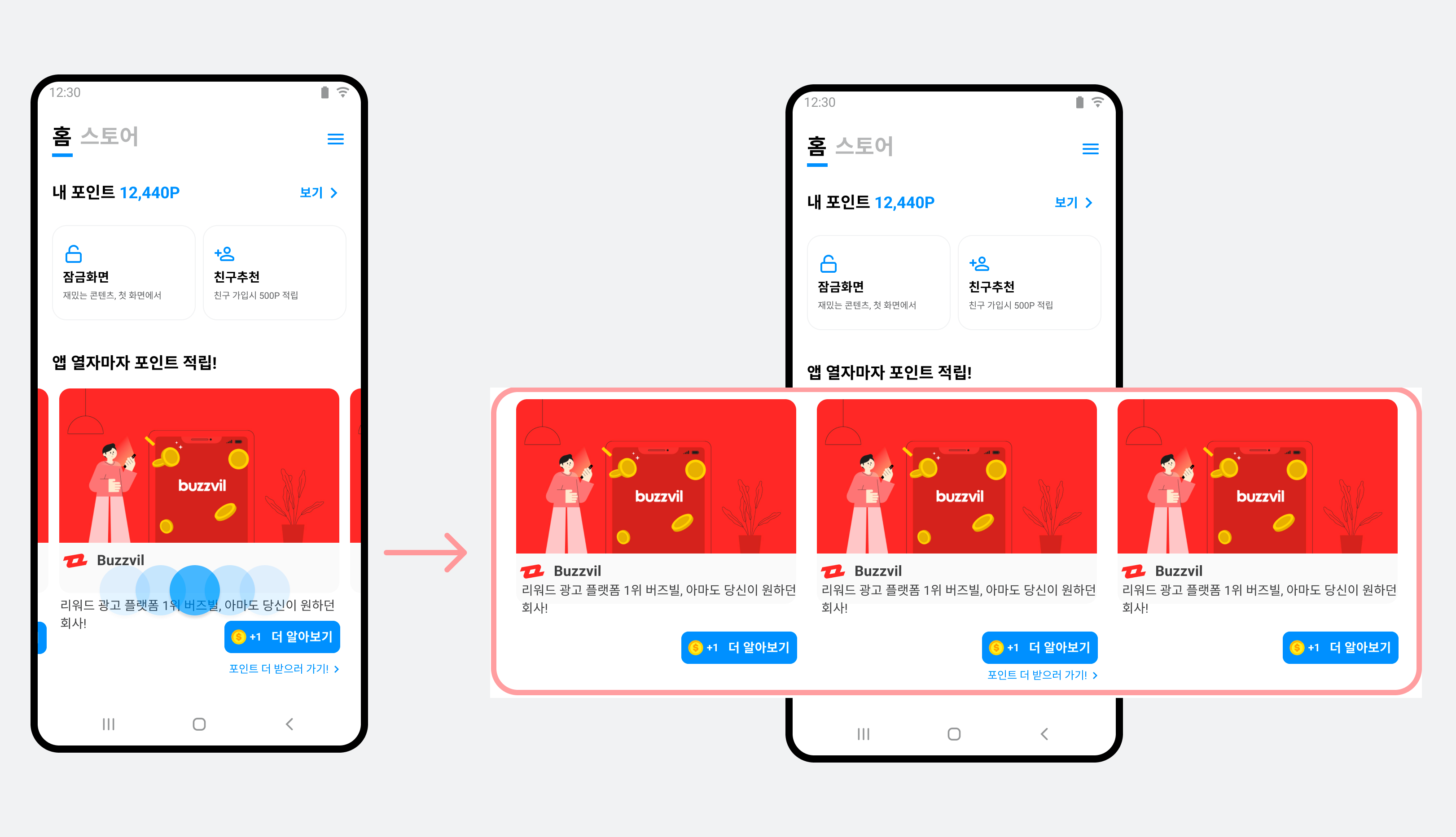 사용자 광고 참여 비율을 일반 네이티브 지면보다 3배나 더 증대할 수 있는 네이티브 캐러셀 광고를 구현할 수 있습니다. BuzzAd의 캐러셀은 무한 루프와 좌우 양방향 스크롤 등 사용자가 더 많은 광고를 보도록 유도하는 기능을 지원합니다. 뿐만 아니라, BuzzAd의 인벤토리 중 가장 많은 광고를 노출하는 피드 지면으로 진입하는 경로도 추가할 수 있습니다. 피드 진입 경로를 추가하면 피드 진입 시 자동으로 적립되는 베이스 리워드 값을 캐러셀에서 미리 보여주어 더욱 효과적으로 피드 진입을 유도할 수 있습니다.