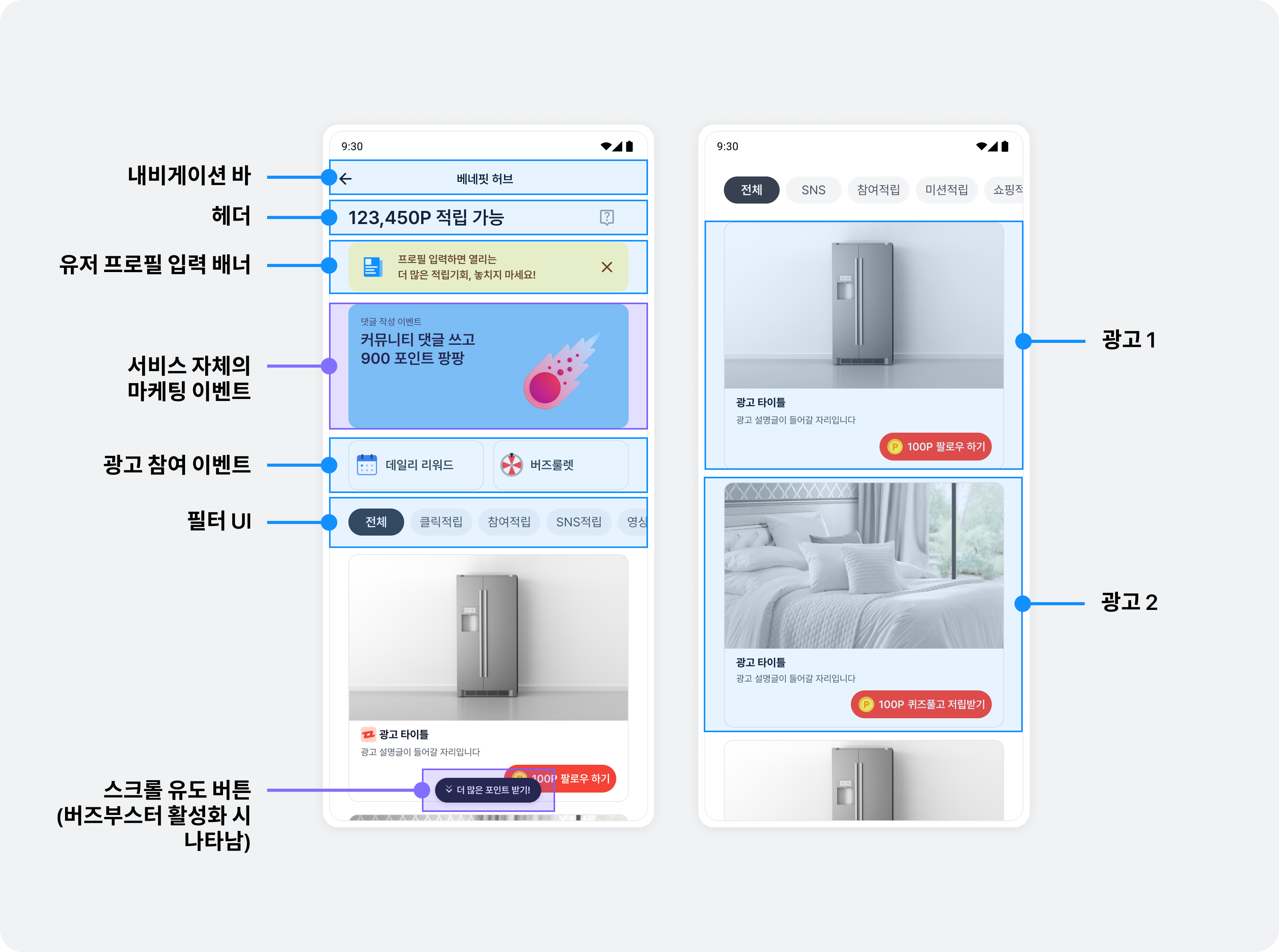 리워드 기반의 광고와 콘텐츠 상품을 풍성하게 제공하고 유저가 지속적으로 수익화에 기여하도록 광고 기반의 다채로운 이벤트를 제공합니다. 유저 인게이지먼트가 결합된 강력한 수익화 인벤토리인 베네핏허브를 기존의 BuzzAd SDK가 제공하던 다양한 진입점 및 기능들과 함께 경험해 보시기 바랍니다.
