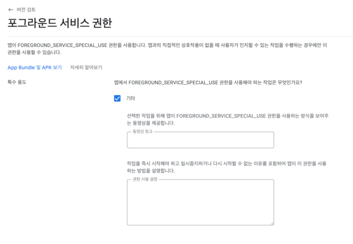 - 권한 사용 설명 예시: 포그라운드 서비스를 사용하는 기능은 Bubble이며, 사용자가 기기의 화면을 켜는 동작의 피드백으로 즉시 제공되어야 합니다. 포그라운드 서비스는 각 동작에 대한 broadcast를 즉각적으로 받기 위해 실행되며, 적절한 포그라운드 카테고리가 없기 때문에 specialUse 권한을 활용합니다.