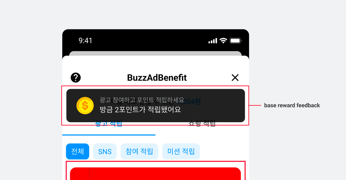 사용자가 광고에 참여하지 않아도 피드 접근 시 일정 주기로 지급되는 기본 포인트의 알림 팝업을 직접 구현하고 디자인을 변경하여 사용자 경험을 개선할 수 있습니다.
