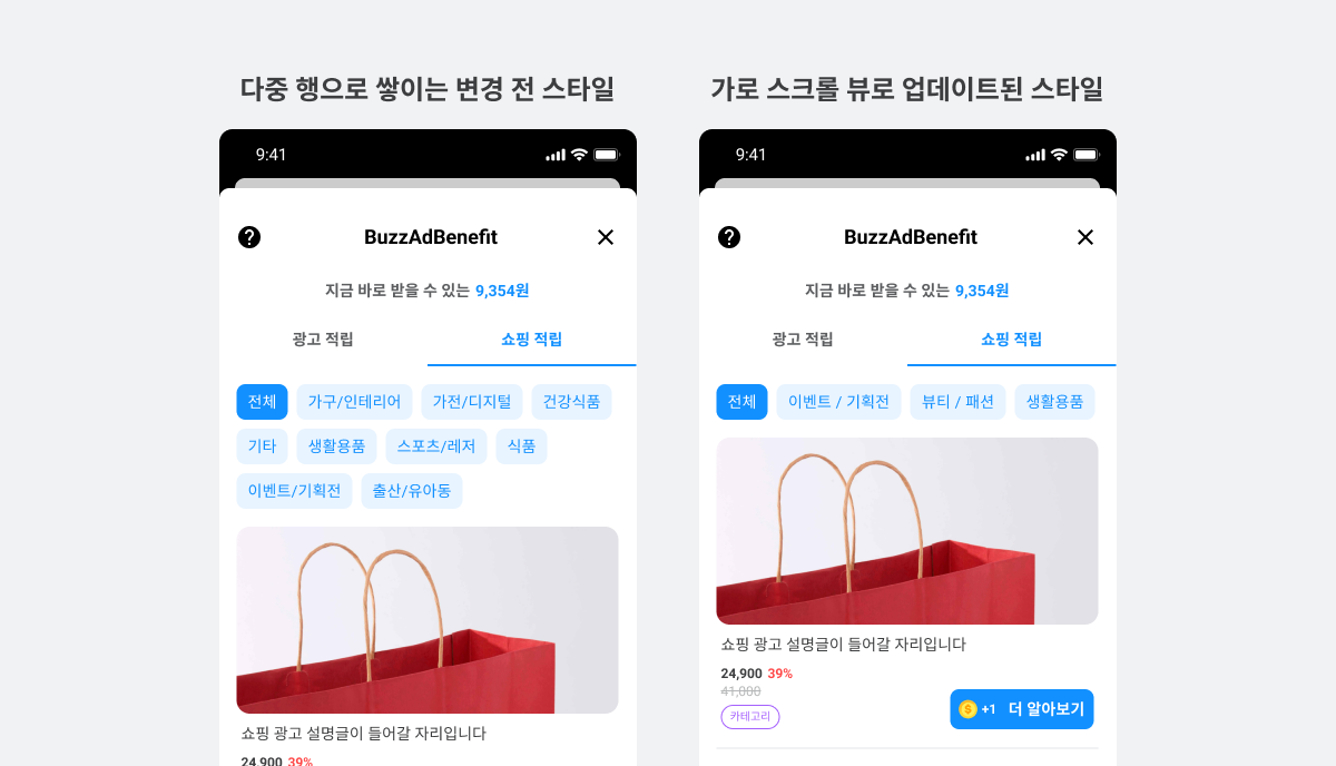피드 지면에서 광고 임프레션 효율을 높이고 사용자의 화면 스크롤 경험을 개선하기 위해 광고 분류 필터를 가로 스크롤 뷰로 변경했습니다.