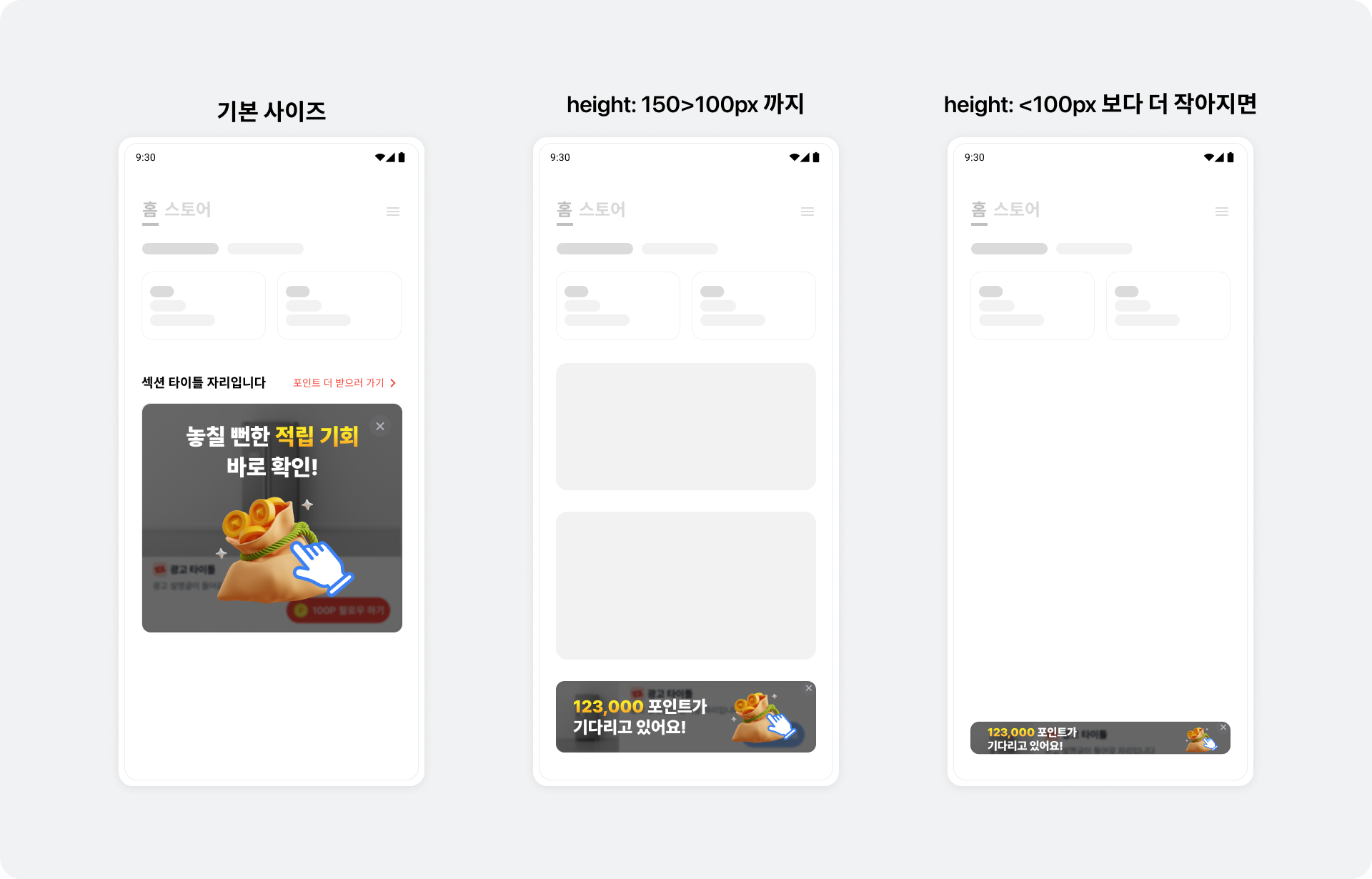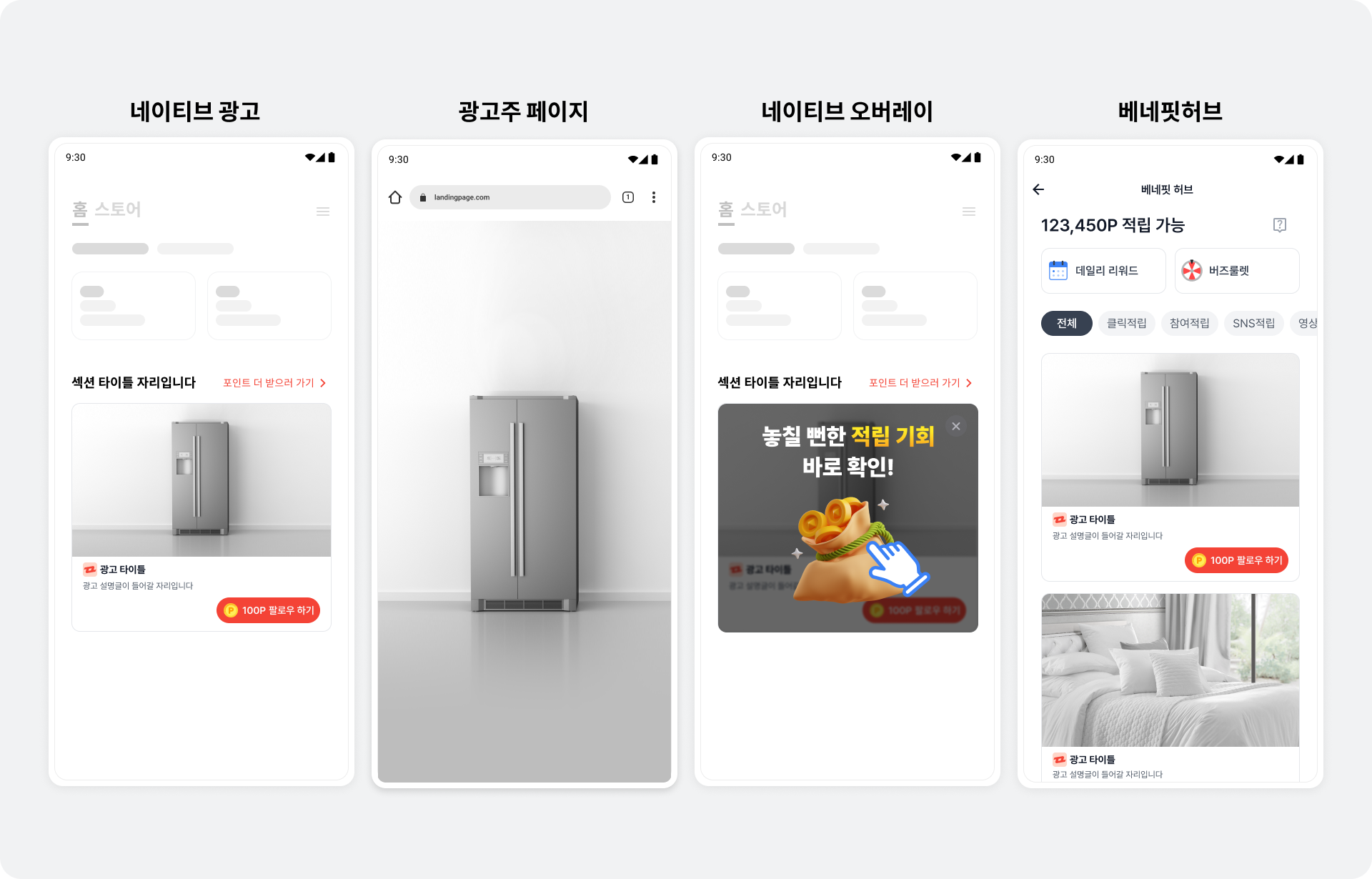 또한, 네이티브 지면 구현 크기에 따른 오버레이 UI 를 제공하며 네이티브 오버레이에서는 베네핏허브 진입 비율을 높이기 위해 유저의 과거 참여 이력을 기반으로 선호하는 광고나 콘텐츠 광고 상품의 UI를 다양하게 노출됩니다.